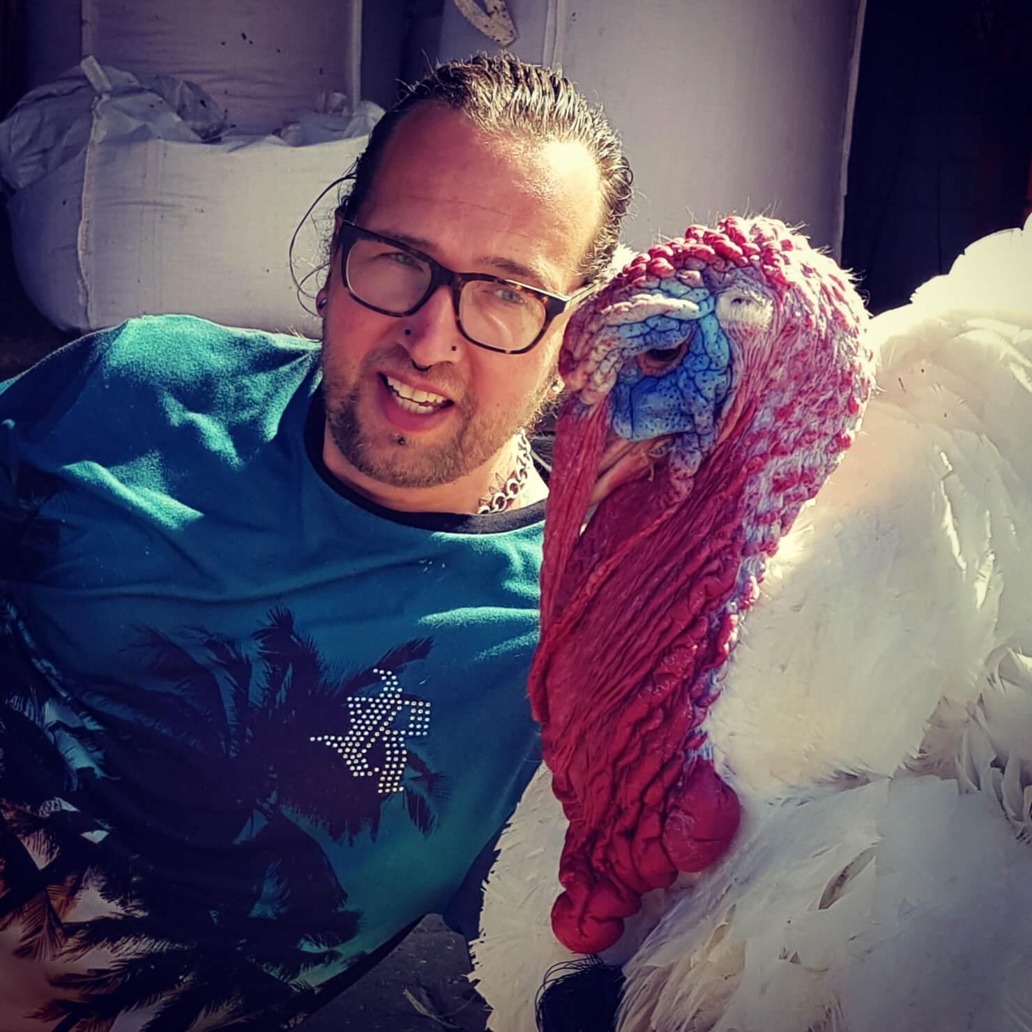Kalkoen Rudi, met Lothar, de spil, het fundament van Melief animal sanctuary. Zonder Lothar zou Melief niet zijn wat het vandaag de dag is. Hij is er altijd voor de dieren, 24/7, van zonsopgang tot zonsondergang én daarna.. Daarom spreken we onze bewondering en dankbaarheid uit voor deze speciale mens, in naam van de dieren 💓