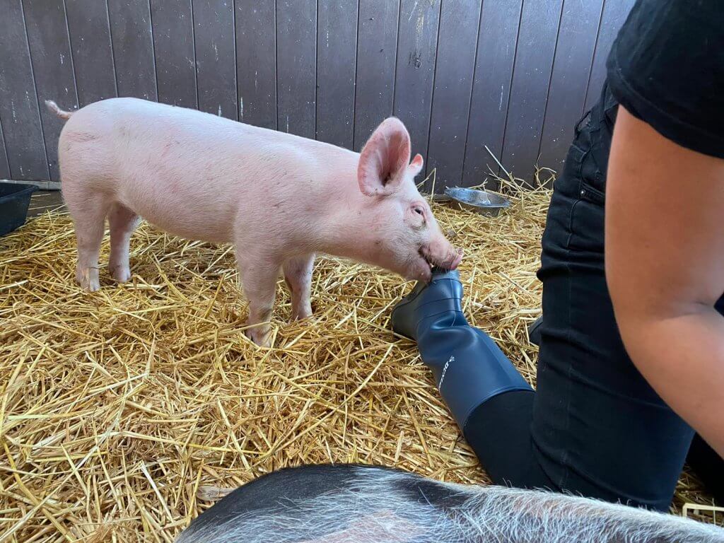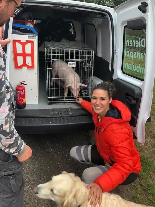 Aufgrund des Coronavirus endete die Saison jedoch abrupt, und die Top-Basketballerin, die in Helmond und Eindhoven aufwuchs, kehrte in die Niederlande zurück, wo sie ein Haus in Rosmalen hat. Stillsitzen ist jedoch nichts für Van Grinsven, die nach dem Studium der Politikwissenschaft einen Master-Abschluss in Human Rights and Animal Rights an der University of London erwarb. In sozialen Medien hat sie sich immer für Tierrechte eingesetzt, aber jetzt hat sie endlich Zeit, ihre Worte in Taten umzusetzen. Also setzte sie sich zusammen mit der internationalen Volleyball-Spielerin Celeste Plak ins Auto und sprach bei sechs grenznahen Bauernhöfen in Deutschland vor, um ein Ferkel zu adoptieren.