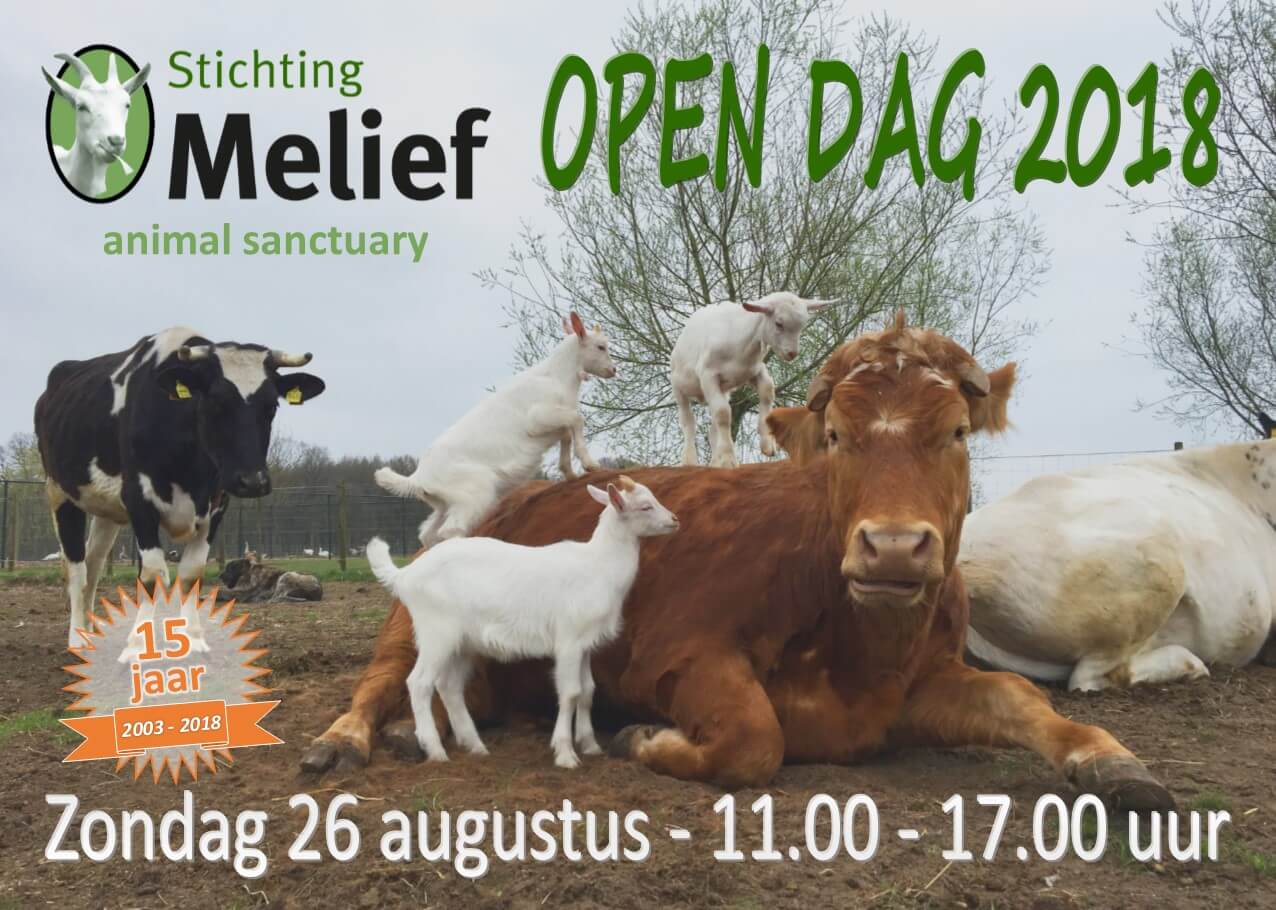 Deze keer staat de dag helemaal in het teken van ons 15-jarig jubileum! Vier met ons mee! Leer de (nieuwe) bewoners bij Melief kennen, geniet van heerlijke diervriendelijke hapjes en drankjes, doe mee met de tombola en bezoek de kleine infomarkt! Vanzelfsprekend alles ter ondersteuning van onze opvang en het welzijn van de dieren!