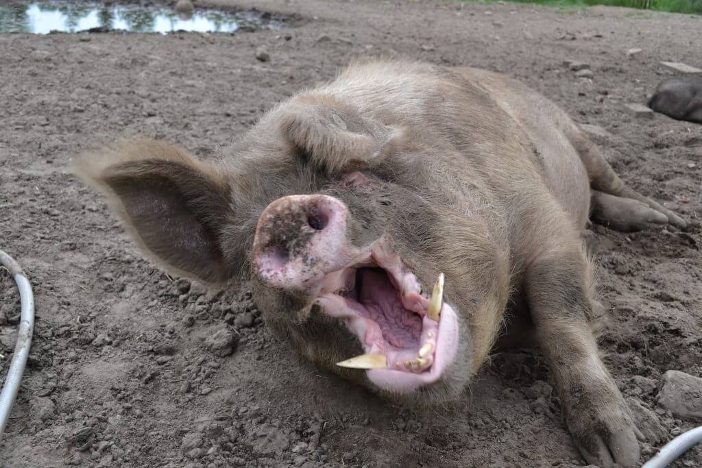 Toen na een paar jaar de oudere varkens in de groep overleden waren, ontpopte Tofu zich tot de leider. Hij ging als eerste in het stro liggen en de rest van de varkens, mini of groot, drapeerden zich om hem heen. Als we in de stal of op de varkenswei kwamen, had Tofu altijd een woordje klaar. Altijd als we hem begroetten, groette hij terug. Zo hebben we in de afgelopen 11 jaar vele goede gesprekken gevoerd… Behalve die ene keer, toen Tofu uit de varkensweide ontsnapt was, en hij niet terug wilde. Marc werd boos op hem, en moest hem onder lichte dwang de wei terug in jagen. Dit beviel Tofu absoluut niet en hij besloot geen woord meer tegen Marc te zeggen. Sterker nog, hij negeerde hem volkomen. Maar na een week of anderhalf, brak het ijs toch weer, en werd er weer gewoon iedere dag gegroet en geknuffeld.